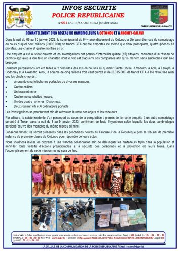 24 janvier 2023 Lire le communiqué officiel Post navigation Précédent Basketball/ DÉMARRAGE DE LA SAISON SPORTIVE 2022-2023: Arbitres, Otm et coaches formés saluent l’initiativeSuivant Mairie de Savalou : Le compte à rebours des activités de l’année 2023 du Secrétaire Exécutif et des Directeurs à divers niveaux officiellement lancé Voir aussi Actualités La Une Médias et inclusion financière au Bénin Le RJCIF créé, Adam HOUETENON élu Président 12 décembre 2025 Actualités Sports CAN MAROC 2025 : les 28 Guépards retenus par Rohr ! 12 décembre 2025 Actualités La Une Politique LES MINISTRES DES AFFAIRES ÉTRANGÈRES DU NIGÉRIA ET DU BÉNIN TIENNENT UNE CONFÉRENCE DE PRESSE CONJOINTE SUR LE RÉTABLISSEMENT DE LA GOUVERNANCE DÉMOCRATIQUE AU BÉNIN ET LA SÉCURITÉ RÉGIONALE 12 décembre 2025