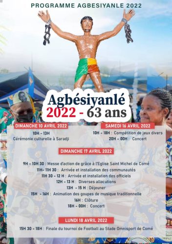 Ainsi, du 10 au 18 avril 2022, plusieurs manifestations sont prévues dont notamment la cérémonie culturelle à Saradji le dimanche 10 avril prochain, la compétition de jeux divers et concert le samedi 16 avril, la grande messe d’action de grâce à l’Eglise Saint Michel de Comè le dimanche 17 avril 2022 et la grande finale du tournoi de football au Stade Omnisport de Comè le lundi 18 avril 2022.