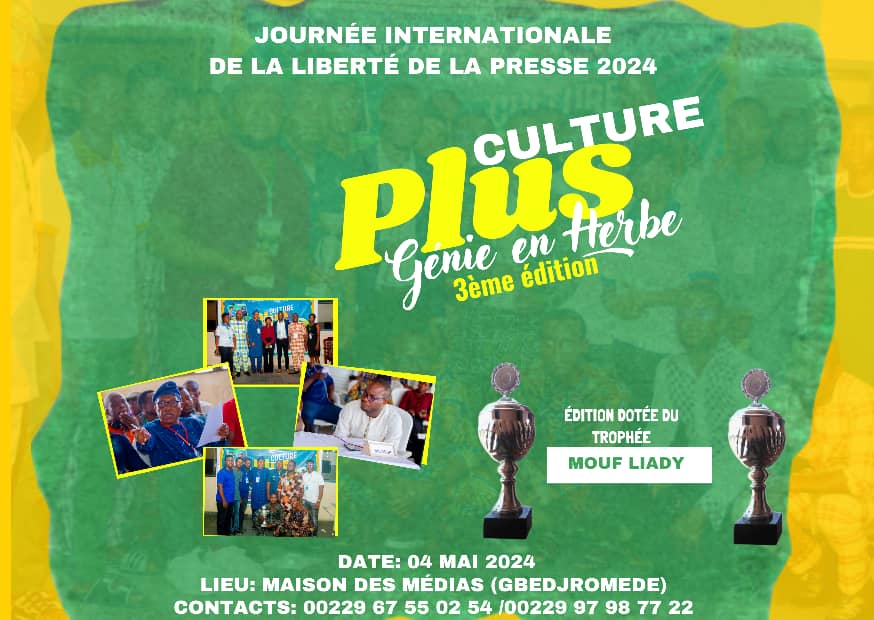 Culture Plus est une compétition cérébrale qui met en opposition plusieurs journalistes à l’occasion de la célébration de la journée internationale de la liberté de la presse. Elle est dédiée exclusivement aux journalistes en général et regroupe pour cette édition, 16 différentes équipes. Elle suit les règles du jeu génie en herbe. A l’issue des deux premières éditions, c’est l’Agence Ecofin qui s’est adjugée le trophée dénommé « Mouf Liady », en s’imposant devant les herbo-génistes de l’ORTB. La succession à la dynamique équipe de Espoir Olodo est ainsi lancée. Les inscriptions sont ouvertes à compter du mardi 20 février 2024 et prendront fin le 30 avril 2024.