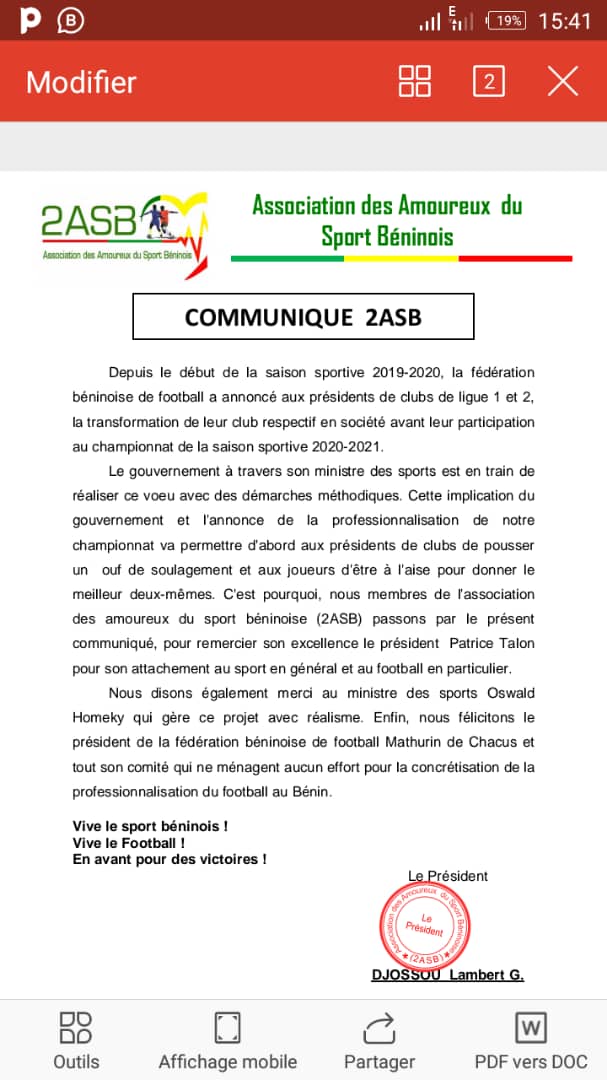 Professionnalisé le sport béninois afin que les acteurs sportifs vivent de leurs arts, tel est l’objectif du gouvernement béninois qui depuis un moment a lancé le processus de professionnalisation du Sport béninois . Un processus qui est entré dans sa phase active avec des discussions effectuées par le ministre des sports Oswald Homeky qui conduit cette grande vision du gouvernement vers un avenir radieux. Séduit par les différentes étapes de ce projet, les membres de l’association des amoureux du sport béninois ( 2ASB) ont tenu a adressé leurs félicitations au ministre Oswald Homeky ainsi qu’au gouvernement à sa tête le président Patrice Talon dont l’ambition est de donner un nouveau souffle au sport béninois. Ils ont aussi profiter de cette occasion pour saluer les efforts inlassables du comité exécutif de la FBF à sa tête Mathurin De Chacus qui accompagne le gouvernement dans ce processus.