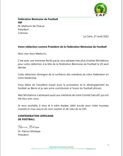 Plébiscité à l’unanimité par les délégués de par leur votes (69 voix/69 voix) lors de l’assemblée générale élective de renouvellement des membres du bureau exécutif de la Fédération béninoise de football (FBF) le samedi 20Août dernier à son siège à Porto-Novo, Mathurin De Chacus a reçu une lettre de félicitations de l’instance dirigeante du football africain (CAF). En effet, c’est à travers un courrier signé du président Patrice Motsepe que le nouvel et ancien président de la FBF a été félicité pour sa réélection à la tête de la FBF, lui et les membres de son bureau exécutif.