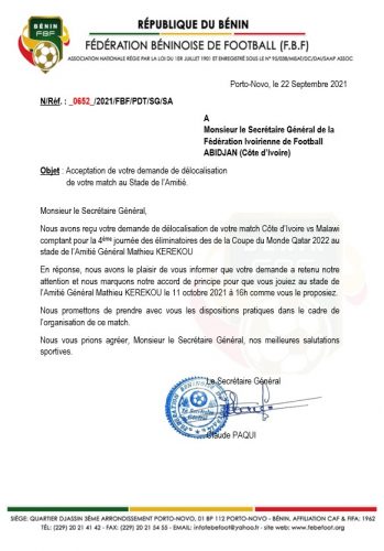 Dans les tuyaux depuis quelques heures, le match opposera la Côte d’Ivoire au Malawi dans le cadre de la quatrième journée des éliminatoires de la Coupe du Monde Qatar 2022 dans le groupe D, aura finalement lieu au Stade Générale Mathieu Kérékou le 11 octobre prochain à partir de 16 heures. Ceci résulte du fait que le Stade de Yamoussoukro n’a pas reçu l’approbation de la CAF pour accueillir la rencontre car ne respectant pas les normes.
