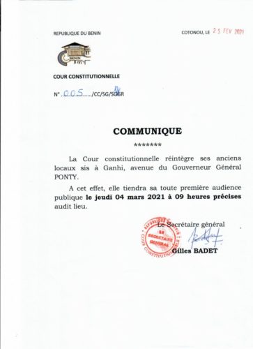 26 février 2021 (Lire le communiqué) Post navigation Précédent Une quinzaine de SFD s’approprient les offres du FNDASuivant Liste des membres de la Coordination Nationale de Campagne du duo Candidat TALON-TALATA Laisser un commentaire Annuler la réponseVous devez vous connecter pour publier un commentaire. Voir aussi Actualités La Une Assemblée Générale UPMB : Hervé Prudence Hessou, plébiscité président ! 4 décembre 2025 Actualités Agriculture La Une Projet CASCADE /Adoption des Régimes Alimentaires Sains et Équilibrés pour la Résilience des Ménages au Bénin : ASCINB outille les points focaux communaux et relais départementaux de ses OSC membres et partenaires des départements du Sud 3 décembre 2025 Actualités La Une Sports CAN Maroc 2025: Louis Houngnandandé et Éric Ayimavo retenus comme officiels 3 décembre 2025