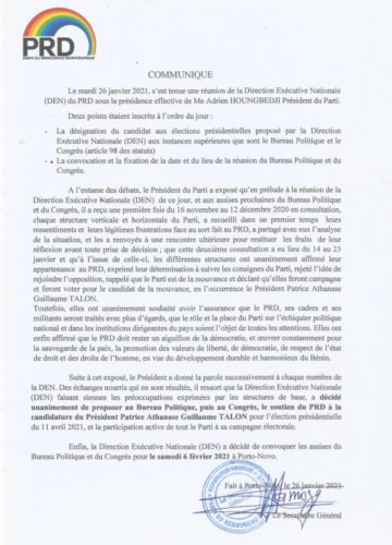 La fumée blanche vient de sortir. Après la consultation de sa base la semaine écoulée dans le cadre des préparatifs pour les présidentielles du 11 Avril prochain, le Président du Parti du Renouveau Démocratique (Prd) Me Adrien Houngbédji et les membres de la Direction Exécutive Nationale, viennent d’entériner la décision des militantes et militants.