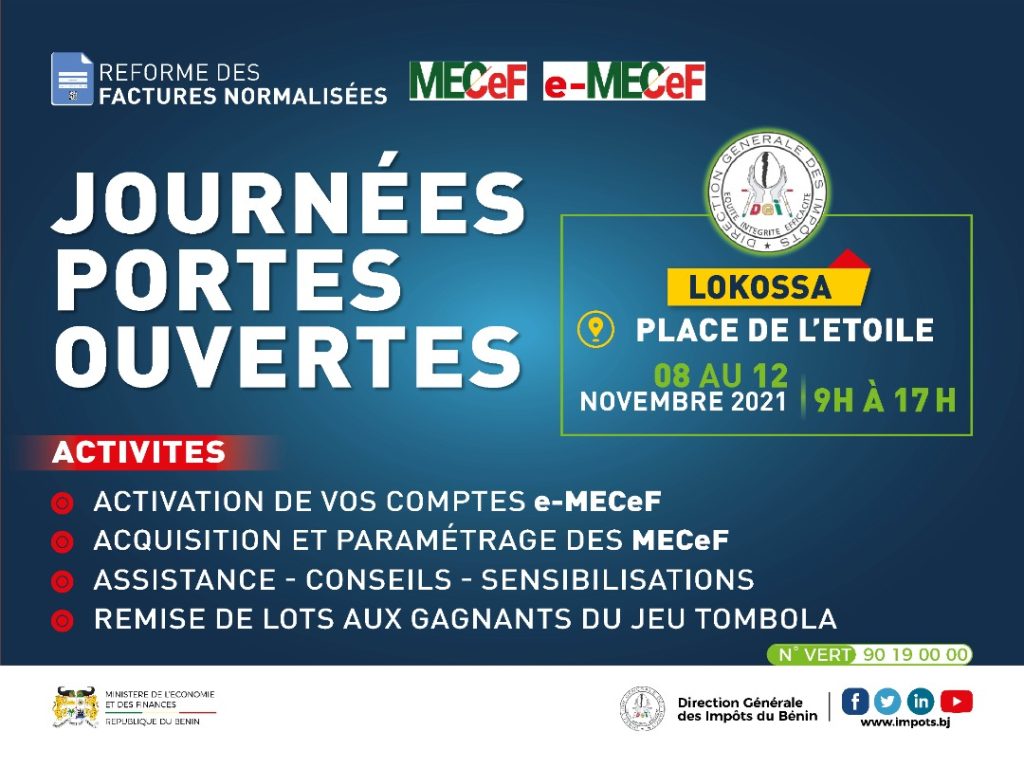 Jamais deux sans trois. Après les étapes de Cotonou et de Parakou il y a seulement quelques mois, la Direction Générale des Impôts(DGI), fidèle à sa vision de mettre les innovations fiscales relatives à la réforme de la facture normalisée à la disposition des populations et contribuables un partout sur létendue du territoire national, a décidé pour la troisième édition des Journées Portes Ouvertes itinérantes quelle a initiées de déposer sa valise à Lokossa. Ainsi, du lundi 8 au vendredi 12 novembre 2021, les populations et acteurs économiques de la cité des Kotafon et ses environs pourront effectuer le déplacement de la Place de lEtoile du chef-lieu du département du Mono pour avoir des informations non seulement riches et variées, mais aussi très utiles sur la réforme de la facture normalisée. Outre les éventuelles préoccupations des visiteurs, six grands points constituent le menu. Il sera essentiellement question de présenter la réforme de la facture normalisée ; daider les contribuables à activer leur compte e-MECeF afin de se conformer à la règlementation ; apporter sur place assistance et conseil aux contribuables dans lacquisition et lutilisation des MECeF(version machine physique) ; sensibiliser les étudiants et toutes les associations concernées par les réformes ; se prêter aux différentes questions des visiteurs ; remettre les lots aux gagnants de la tombola de la facture normalisée. Comme on peut se le persuader, cest une aubaine à ne rater sous aucun prétexte. Ces Journées Portes Ouvertes sont donc dune grande importance pour les populations, contribuables et tous les acteurs de développement de Lokossa et environs. Tous sont invités à effectuer massivement le déplacement.