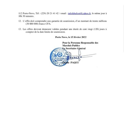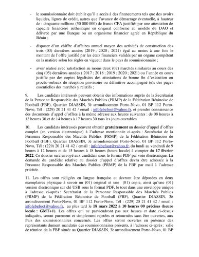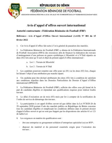 Avis d’Appel d’Offres Ouvert International (AAOI) N° 001 du 15 février 2022 : La Fédération Béninoise de Football (FBF) lance la réalisation des travaux d’aménagement d’une pelouse en gazon synthétique à Missérété et à N’Dali répartis en deux (02) lots