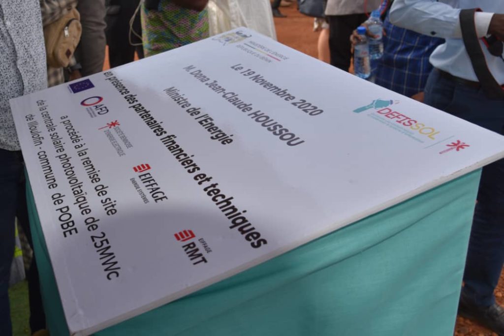Dun montant total de près de 40 milliards de FCFA (60,5 millions deuros), le projet DEFISSOL est cofinancé à hauteur de 32,8 milliards FCFA par lAFD et de 6,6 milliards FCFA par lUnion européenne. Il prévoit dune part la construction dune centrale photovoltaïque de 25 mégawatts dans la commune de Pobè, la première centrale solaire denvergure au Bénin et lune des plus importantes dAfrique de lOuest et dautre part la modernisation du système informatique de la SBEE.