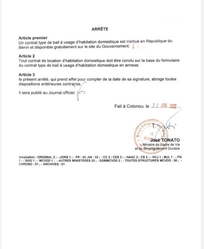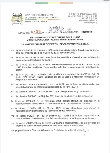 Recevez en images l’arrêté N°0120/MCVDD/DC/SGM/DGHC/DCLR/SLR/SA et le Contrat type de bail à usage d’habitation domestique en République du Bénin.