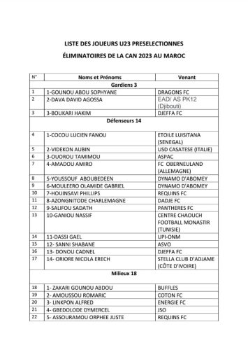 En prélude aux éliminatoires de la CAN Maroc U23 2023, le sélectionneur national Bruno Goudjo a dévoilé la liste de 45 présélectionnés. Une liste élargie qui permettra au staff technique de faire le tri afin d’en retenir que les 25 meilleurs après la phase de la sélection.