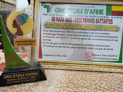 Quelques jours plus tard le Bénin à travers l’ONG Étoilés D’AFRIK honore cette femme étoile avec le prix de » reconnaissance » et de » mérite femme battante ». Ce prix vient encore relancer cette élue locale togolaise dans sa noble vision et action déterminante. Muhamed Trahir BADELE , président du comité d’organisation du prix femme battante 2021, trophé et distinction compte rééditer chaque année cet événement pour mettre la femme au coeur de l’étoile.