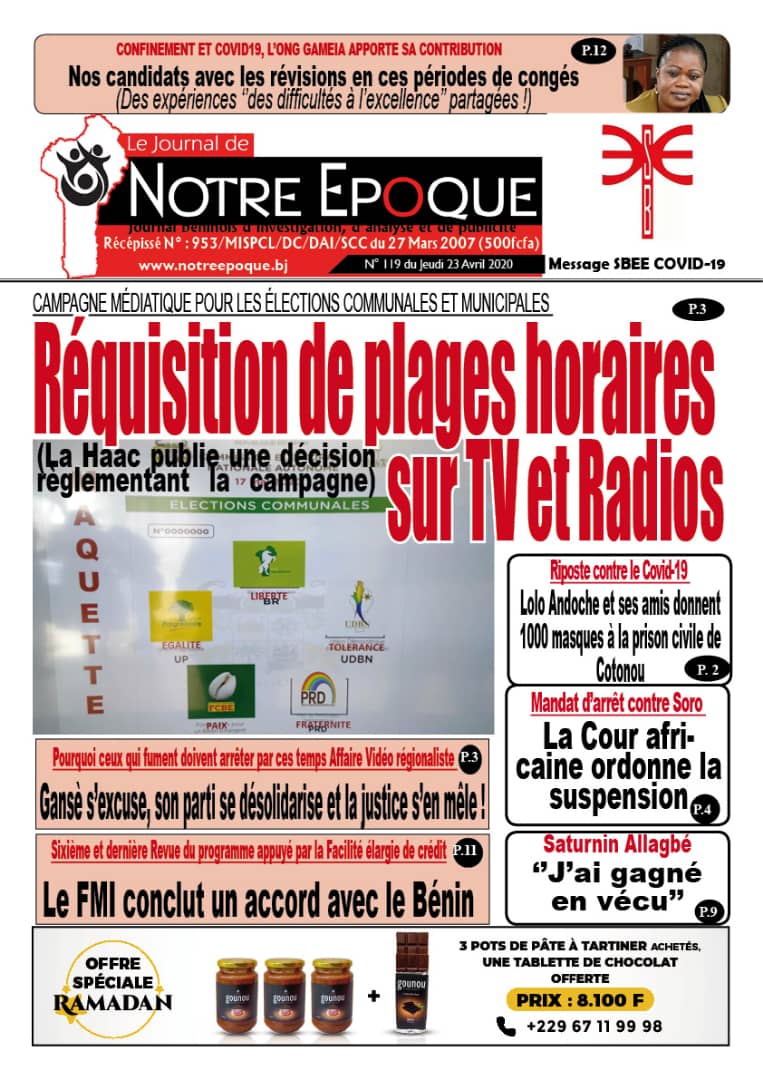 23 avril 2020 Télécharger : Notre Epoque 119 du Jeudi 23 Avril 2020 Post navigation Précédent Lolo Andoche et ses amis donnent 1000 masques à la prison civile de Cotonou.Suivant Porto-Novo, le chêne et le roseau ! Laisser un commentaire Annuler la réponseVous devez vous connecter pour publier un commentaire. Voir aussi Actualités La Une Médias et inclusion financière au Bénin Le RJCIF créé, Adam HOUETENON élu Président 12 décembre 2025 Actualités La Une Politique LES MINISTRES DES AFFAIRES ÉTRANGÈRES DU NIGÉRIA ET DU BÉNIN TIENNENT UNE CONFÉRENCE DE PRESSE CONJOINTE SUR LE RÉTABLISSEMENT DE LA GOUVERNANCE DÉMOCRATIQUE AU BÉNIN ET LA SÉCURITÉ RÉGIONALE 12 décembre 2025 Actualités La Une JIV 2025 : L’AnpE et la PNOVEJ célèbrent les volontaires sous le signe de l’engagement citoyen 12 décembre 2025