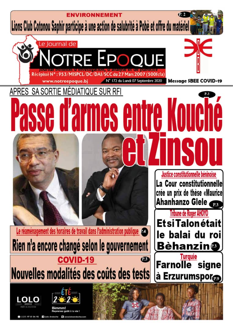 7 septembre 2020 Télécharger : Notre Epoque 172 du Lundi 07 Septembre 2020 Post navigation Précédent Moïse Adilehou file aux Pays-BasSuivant L’ANIP Élabore le document de stratégie nationale pour la période 2020-2025 Laisser un commentaire Annuler la réponseVous devez vous connecter pour publier un commentaire. Voir aussi Actualités La Une Médias et inclusion financière au Bénin Le RJCIF créé, Adam HOUETENON élu Président 12 décembre 2025 Actualités La Une Politique LES MINISTRES DES AFFAIRES ÉTRANGÈRES DU NIGÉRIA ET DU BÉNIN TIENNENT UNE CONFÉRENCE DE PRESSE CONJOINTE SUR LE RÉTABLISSEMENT DE LA GOUVERNANCE DÉMOCRATIQUE AU BÉNIN ET LA SÉCURITÉ RÉGIONALE 12 décembre 2025 Actualités La Une JIV 2025 : L’AnpE et la PNOVEJ célèbrent les volontaires sous le signe de l’engagement citoyen 12 décembre 2025