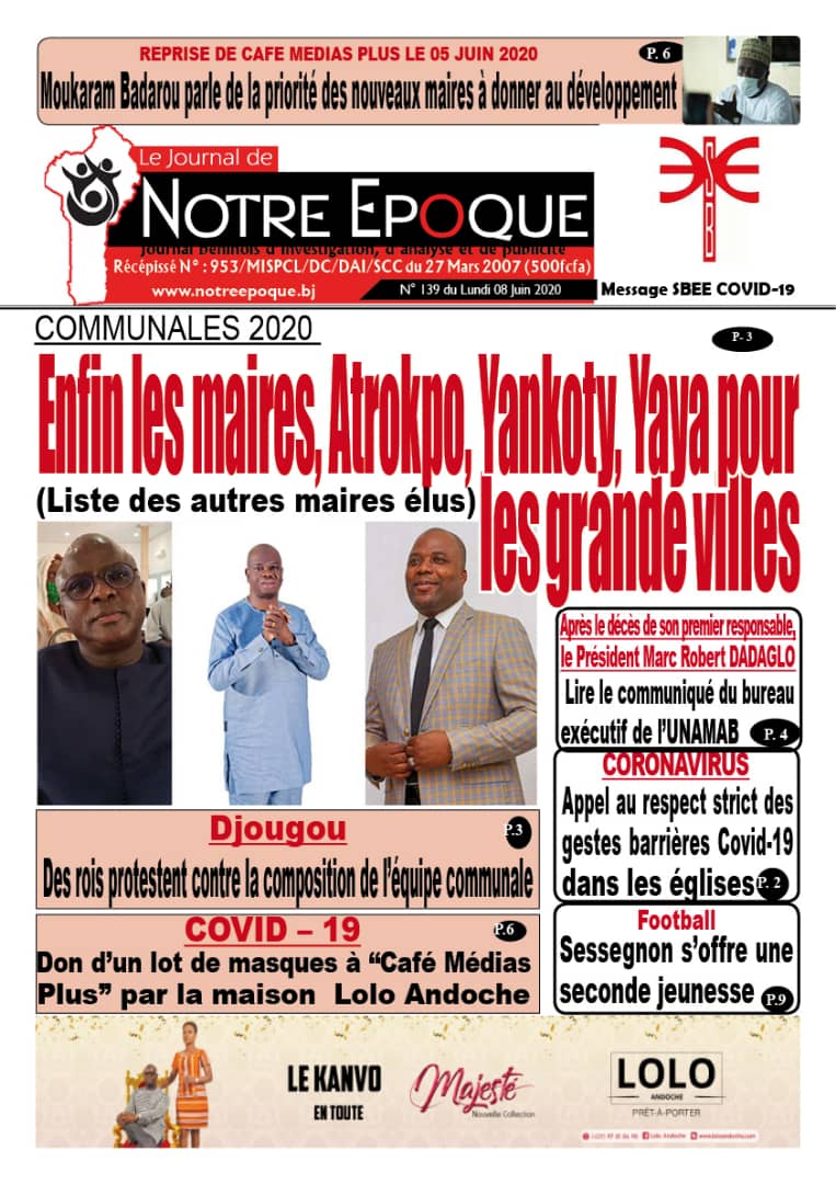 8 juin 2020 Télécharger : Notre Epoque 139 du Lundi 08 Juin 2020 Post navigation Précédent Nomenclature des membres de l’Exécutif Communal et des Chefs des 7 Arrondissements de la Commune de Sô-Ava , 4ème MandatureSuivant Charles Toko dresse son bilan de près que 4ans. Laisser un commentaire Annuler la réponseVous devez vous connecter pour publier un commentaire. Voir aussi Actualités La Une Médias et inclusion financière au Bénin Le RJCIF créé, Adam HOUETENON élu Président 12 décembre 2025 Actualités La Une Politique LES MINISTRES DES AFFAIRES ÉTRANGÈRES DU NIGÉRIA ET DU BÉNIN TIENNENT UNE CONFÉRENCE DE PRESSE CONJOINTE SUR LE RÉTABLISSEMENT DE LA GOUVERNANCE DÉMOCRATIQUE AU BÉNIN ET LA SÉCURITÉ RÉGIONALE 12 décembre 2025 Actualités La Une JIV 2025 : L’AnpE et la PNOVEJ célèbrent les volontaires sous le signe de l’engagement citoyen 12 décembre 2025