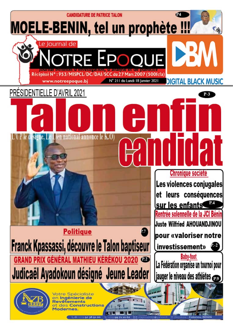 18 janvier 2021 Télécharger : Notre Epoque 211 du Lundi 18 Janvier 2021 Post navigation Précédent Recrutement des délégués pour la Présidentielle de 2021Suivant L’UDBN, se met en alerte maximale pour mouiller le maillot Laisser un commentaire Annuler la réponseVous devez vous connecter pour publier un commentaire. Voir aussi Actualités La Une Assemblée Générale UPMB : Hervé Prudence Hessou, plébiscité président ! 4 décembre 2025 Actualités Agriculture La Une Projet CASCADE /Adoption des Régimes Alimentaires Sains et Équilibrés pour la Résilience des Ménages au Bénin : ASCINB outille les points focaux communaux et relais départementaux de ses OSC membres et partenaires des départements du Sud 3 décembre 2025 Actualités La Une Sports CAN Maroc 2025: Louis Houngnandandé et Éric Ayimavo retenus comme officiels 3 décembre 2025