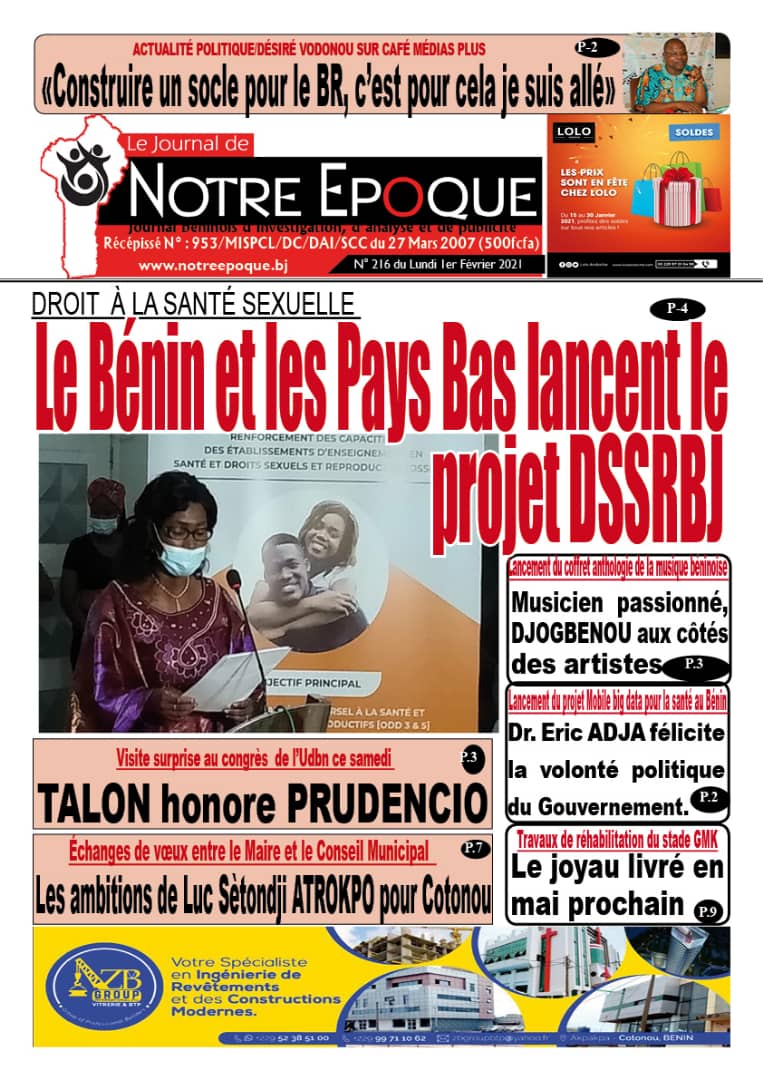 5 février 2021 Télécharger :Notre Epoque 216 du Lundi 1er Févier 2021 Post navigation Précédent Le joyau livré en mai prochainSuivant Fally Ipupa valorise la marque Lolo Andoche Laisser un commentaire Annuler la réponseVous devez vous connecter pour publier un commentaire. Voir aussi Actualités La Une Médias et inclusion financière au Bénin Le RJCIF créé, Adam HOUETENON élu Président 12 décembre 2025 Actualités La Une Politique LES MINISTRES DES AFFAIRES ÉTRANGÈRES DU NIGÉRIA ET DU BÉNIN TIENNENT UNE CONFÉRENCE DE PRESSE CONJOINTE SUR LE RÉTABLISSEMENT DE LA GOUVERNANCE DÉMOCRATIQUE AU BÉNIN ET LA SÉCURITÉ RÉGIONALE 12 décembre 2025 Actualités La Une JIV 2025 : L’AnpE et la PNOVEJ célèbrent les volontaires sous le signe de l’engagement citoyen 12 décembre 2025