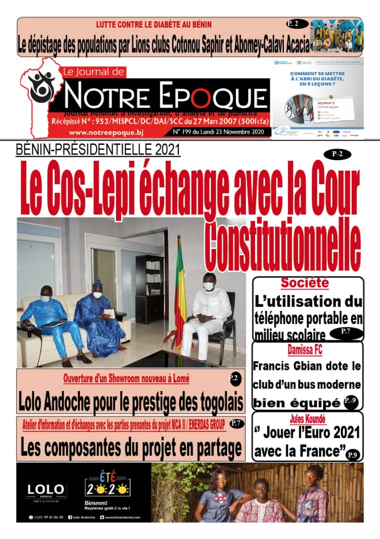 23 novembre 2020 Télécharger : Notre Epoque 199 du Lundi 23 Novembre 2020 Post navigation Précédent DECLARATION SUR LA TOURNEE DU PRESIDENT PATRICE TALON DANS LES COMMUNESSuivant Les 11 moments qui ont marqué à jamais la santé de Maradona Laisser un commentaire Annuler la réponseVous devez vous connecter pour publier un commentaire. Voir aussi Actualités La Une Médias et inclusion financière au Bénin Le RJCIF créé, Adam HOUETENON élu Président 12 décembre 2025 Actualités La Une Politique LES MINISTRES DES AFFAIRES ÉTRANGÈRES DU NIGÉRIA ET DU BÉNIN TIENNENT UNE CONFÉRENCE DE PRESSE CONJOINTE SUR LE RÉTABLISSEMENT DE LA GOUVERNANCE DÉMOCRATIQUE AU BÉNIN ET LA SÉCURITÉ RÉGIONALE 12 décembre 2025 Actualités La Une JIV 2025 : L’AnpE et la PNOVEJ célèbrent les volontaires sous le signe de l’engagement citoyen 12 décembre 2025