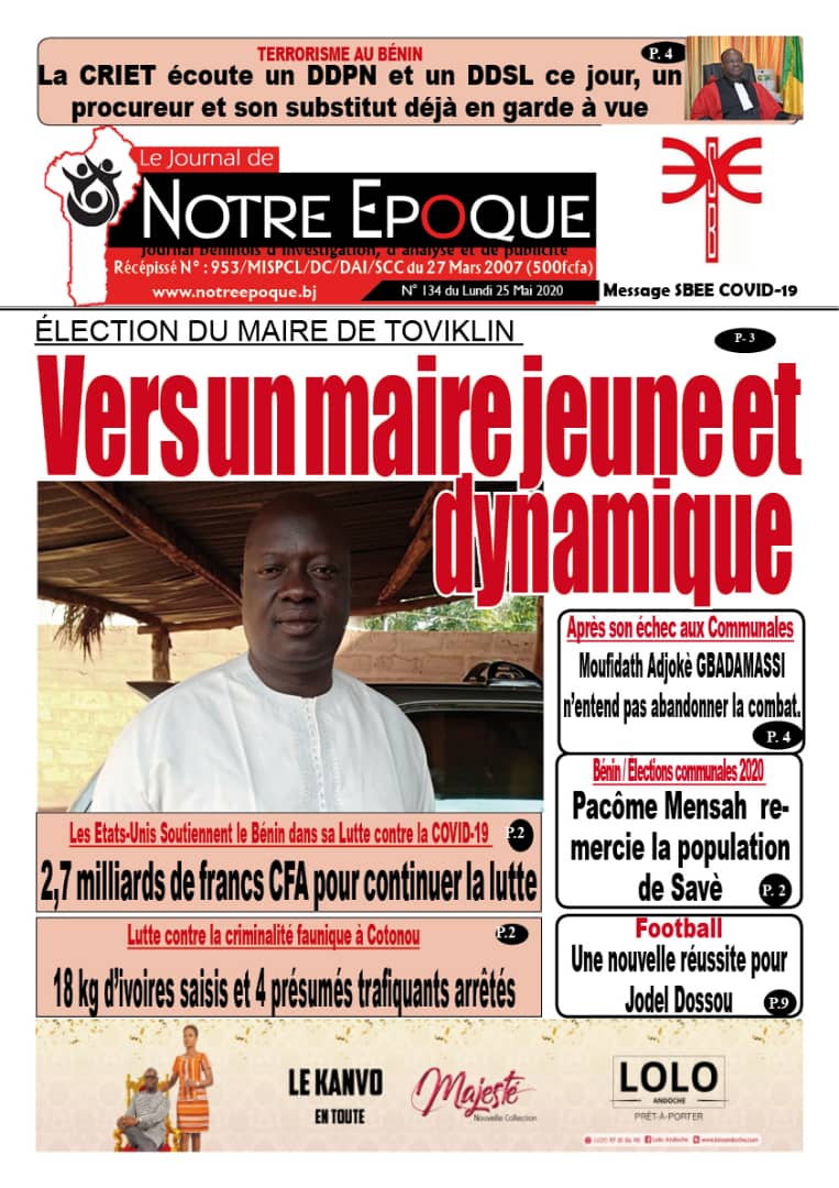25 mai 2020 Télécharger : Notre Epoque 134 du Lundi 25 Mai 2020 Post navigation Précédent Vers un maire jeune et dynamiqueSuivant Radiés, les 84 démissionnaires réintégrés Laisser un commentaire Annuler la réponseVous devez vous connecter pour publier un commentaire. Voir aussi Actualités La Une Médias et inclusion financière au Bénin Le RJCIF créé, Adam HOUETENON élu Président 12 décembre 2025 Actualités La Une Politique LES MINISTRES DES AFFAIRES ÉTRANGÈRES DU NIGÉRIA ET DU BÉNIN TIENNENT UNE CONFÉRENCE DE PRESSE CONJOINTE SUR LE RÉTABLISSEMENT DE LA GOUVERNANCE DÉMOCRATIQUE AU BÉNIN ET LA SÉCURITÉ RÉGIONALE 12 décembre 2025 Actualités La Une JIV 2025 : L’AnpE et la PNOVEJ célèbrent les volontaires sous le signe de l’engagement citoyen 12 décembre 2025
