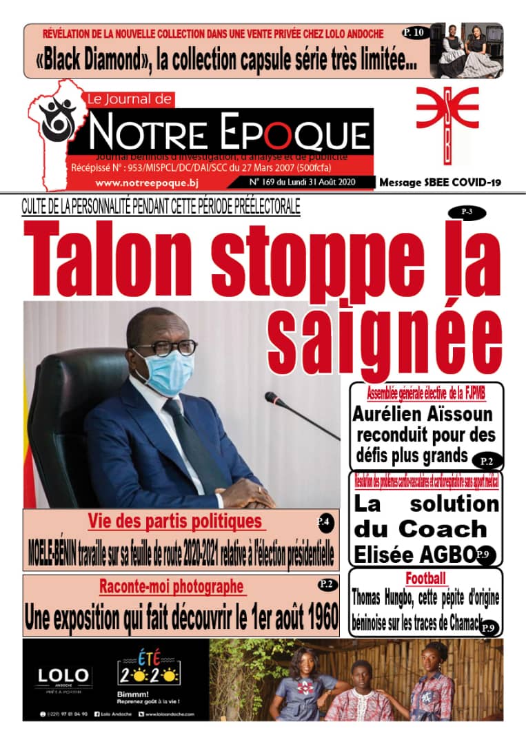 31 août 2020 Télécharger : Notre Epoque 169 du Lundi 31 Août 2020 Post navigation Précédent La solution du Coach Elisée AGBOSuivant Le président Vlavonou touche du doigt le nouveau « Kanvo by Lolo Andoche » Laisser un commentaire Annuler la réponseVous devez vous connecter pour publier un commentaire. Voir aussi Actualités La Une Assemblée Générale UPMB : Hervé Prudence Hessou, plébiscité président ! 4 décembre 2025 Actualités Agriculture La Une Projet CASCADE /Adoption des Régimes Alimentaires Sains et Équilibrés pour la Résilience des Ménages au Bénin : ASCINB outille les points focaux communaux et relais départementaux de ses OSC membres et partenaires des départements du Sud 3 décembre 2025 Actualités La Une Sports CAN Maroc 2025: Louis Houngnandandé et Éric Ayimavo retenus comme officiels 3 décembre 2025