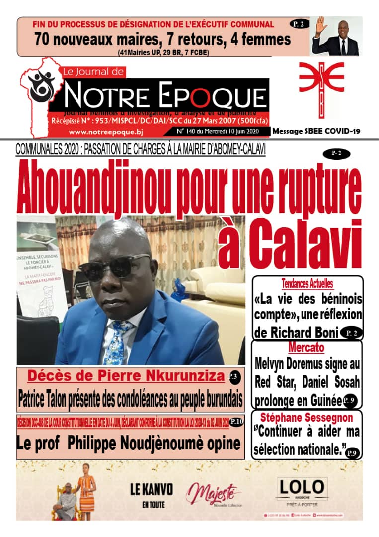 10 juin 2020 Télécharger : Notre Epoque 140 du Mercredi 10 Juin 2020 Post navigation Précédent TOUT SAVOIR SUR LA PLATEFORME E-LEARNING POUR LES ÉTUDIANTS AU BÉNINSuivant Près de 74, 12 milliards prévus Laisser un commentaire Annuler la réponseVous devez vous connecter pour publier un commentaire. Voir aussi Actualités La Une Médias et inclusion financière au Bénin Le RJCIF créé, Adam HOUETENON élu Président 12 décembre 2025 Actualités La Une Politique LES MINISTRES DES AFFAIRES ÉTRANGÈRES DU NIGÉRIA ET DU BÉNIN TIENNENT UNE CONFÉRENCE DE PRESSE CONJOINTE SUR LE RÉTABLISSEMENT DE LA GOUVERNANCE DÉMOCRATIQUE AU BÉNIN ET LA SÉCURITÉ RÉGIONALE 12 décembre 2025 Actualités La Une JIV 2025 : L’AnpE et la PNOVEJ célèbrent les volontaires sous le signe de l’engagement citoyen 12 décembre 2025