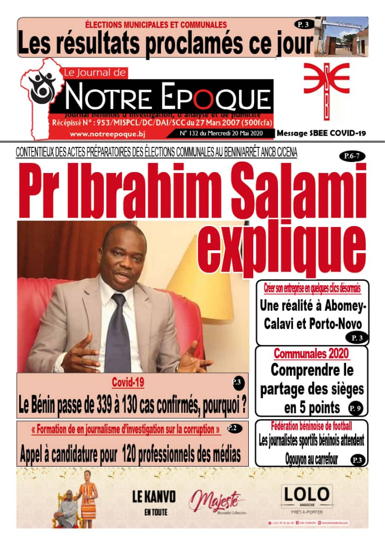 20 mai 2020 Télécharger : Notre Epoque 132 du Mercredi 20 Mai 2020 Post navigation Précédent Comprendre le partage des sièges en 5 pointsSuivant D’éminents experts de la finance inclusive d’Afrique et des Caraïbes sont annoncés Laisser un commentaire Annuler la réponseVous devez vous connecter pour publier un commentaire. Voir aussi Actualités La Une Médias et inclusion financière au Bénin Le RJCIF créé, Adam HOUETENON élu Président 12 décembre 2025 Actualités La Une Politique LES MINISTRES DES AFFAIRES ÉTRANGÈRES DU NIGÉRIA ET DU BÉNIN TIENNENT UNE CONFÉRENCE DE PRESSE CONJOINTE SUR LE RÉTABLISSEMENT DE LA GOUVERNANCE DÉMOCRATIQUE AU BÉNIN ET LA SÉCURITÉ RÉGIONALE 12 décembre 2025 Actualités La Une JIV 2025 : L’AnpE et la PNOVEJ célèbrent les volontaires sous le signe de l’engagement citoyen 12 décembre 2025