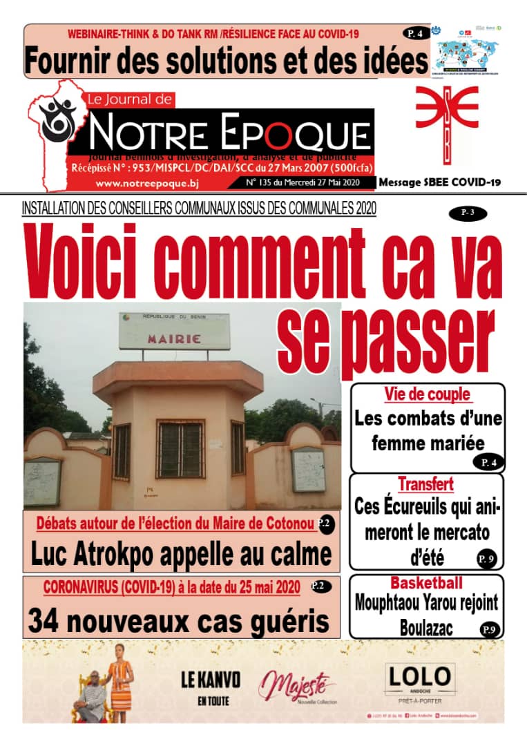 27 mai 2020 Télécharger : Notre Epoque 135 du Mercredi 2020 Post navigation Précédent Daniel Sosah, la convoitise en AlgérieSuivant Lieux de culte, Bars, transports en commun reprennent du service mais… Laisser un commentaire Annuler la réponseVous devez vous connecter pour publier un commentaire. Voir aussi Actualités La Une Médias et inclusion financière au Bénin Le RJCIF créé, Adam HOUETENON élu Président 12 décembre 2025 Actualités La Une Politique LES MINISTRES DES AFFAIRES ÉTRANGÈRES DU NIGÉRIA ET DU BÉNIN TIENNENT UNE CONFÉRENCE DE PRESSE CONJOINTE SUR LE RÉTABLISSEMENT DE LA GOUVERNANCE DÉMOCRATIQUE AU BÉNIN ET LA SÉCURITÉ RÉGIONALE 12 décembre 2025 Actualités La Une JIV 2025 : L’AnpE et la PNOVEJ célèbrent les volontaires sous le signe de l’engagement citoyen 12 décembre 2025