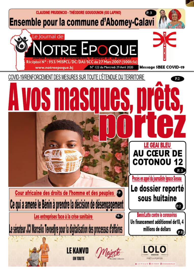 29 avril 2020 Télécharger :Notre Epoque 122 du 29 Avril 2020 Post navigation Précédent Promouvoir et à accroître le commerce et l’investissement entre les pays africains et arabesSuivant La France soutient avec un appui direct 2 milliards de FCFA Laisser un commentaire Annuler la réponseVous devez vous connecter pour publier un commentaire. Voir aussi Actualités La Une Médias et inclusion financière au Bénin Le RJCIF créé, Adam HOUETENON élu Président 12 décembre 2025 Actualités La Une Politique LES MINISTRES DES AFFAIRES ÉTRANGÈRES DU NIGÉRIA ET DU BÉNIN TIENNENT UNE CONFÉRENCE DE PRESSE CONJOINTE SUR LE RÉTABLISSEMENT DE LA GOUVERNANCE DÉMOCRATIQUE AU BÉNIN ET LA SÉCURITÉ RÉGIONALE 12 décembre 2025 Actualités La Une JIV 2025 : L’AnpE et la PNOVEJ célèbrent les volontaires sous le signe de l’engagement citoyen 12 décembre 2025