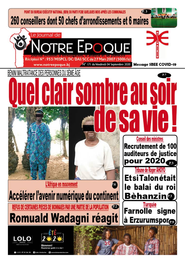 4 septembre 2020 Télécharger : Notre Epoque 171 du Vendredi 04 Septembre 2020 Post navigation Précédent Moïse Adilehou file aux Pays-BasSuivant LE JAPON PROMET SON EXPERTISE AU GOUVERNEMENT BÉNINOIS (L’ambassadeur Takahisa TSUGAWA reçu par le Ministre Alain OROUNLA) Laisser un commentaire Annuler la réponseVous devez vous connecter pour publier un commentaire. Voir aussi Actualités La Une Médias et inclusion financière au Bénin Le RJCIF créé, Adam HOUETENON élu Président 12 décembre 2025 Actualités La Une Politique LES MINISTRES DES AFFAIRES ÉTRANGÈRES DU NIGÉRIA ET DU BÉNIN TIENNENT UNE CONFÉRENCE DE PRESSE CONJOINTE SUR LE RÉTABLISSEMENT DE LA GOUVERNANCE DÉMOCRATIQUE AU BÉNIN ET LA SÉCURITÉ RÉGIONALE 12 décembre 2025 Actualités La Une JIV 2025 : L’AnpE et la PNOVEJ célèbrent les volontaires sous le signe de l’engagement citoyen 12 décembre 2025