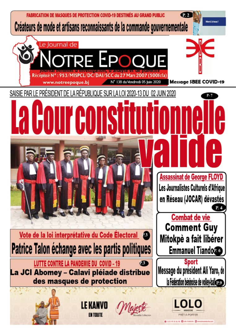 5 juin 2020 Télécharger : Notre Epoque 138 du Vendredi 05 Juin 2020 Post navigation Précédent Loi n° 2020-13 Portant interprétation et complétant la loi n°2019-43 du15 novembre 2019 portant code électoralSuivant Don d’un lot de masques à “Café Médias Plus” par la maison Lolo Andoche Laisser un commentaire Annuler la réponseVous devez vous connecter pour publier un commentaire. Voir aussi Actualités La Une Médias et inclusion financière au Bénin Le RJCIF créé, Adam HOUETENON élu Président 12 décembre 2025 Actualités La Une Politique LES MINISTRES DES AFFAIRES ÉTRANGÈRES DU NIGÉRIA ET DU BÉNIN TIENNENT UNE CONFÉRENCE DE PRESSE CONJOINTE SUR LE RÉTABLISSEMENT DE LA GOUVERNANCE DÉMOCRATIQUE AU BÉNIN ET LA SÉCURITÉ RÉGIONALE 12 décembre 2025 Actualités La Une JIV 2025 : L’AnpE et la PNOVEJ célèbrent les volontaires sous le signe de l’engagement citoyen 12 décembre 2025
