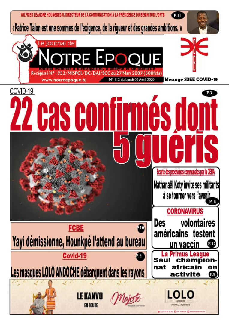 6 avril 2020 Télécharger : Notre Epoque 112 du 06 Avril 2020 Post navigation Précédent le coronavirus met en danger les élites dirigeantesSuivant Les masques LOLO ANDOCHE débarquent dans les rayons Laisser un commentaire Annuler la réponseVous devez vous connecter pour publier un commentaire. Voir aussi Actualités La Une Médias et inclusion financière au Bénin Le RJCIF créé, Adam HOUETENON élu Président 12 décembre 2025 Actualités La Une Politique LES MINISTRES DES AFFAIRES ÉTRANGÈRES DU NIGÉRIA ET DU BÉNIN TIENNENT UNE CONFÉRENCE DE PRESSE CONJOINTE SUR LE RÉTABLISSEMENT DE LA GOUVERNANCE DÉMOCRATIQUE AU BÉNIN ET LA SÉCURITÉ RÉGIONALE 12 décembre 2025 Actualités La Une JIV 2025 : L’AnpE et la PNOVEJ célèbrent les volontaires sous le signe de l’engagement citoyen 12 décembre 2025