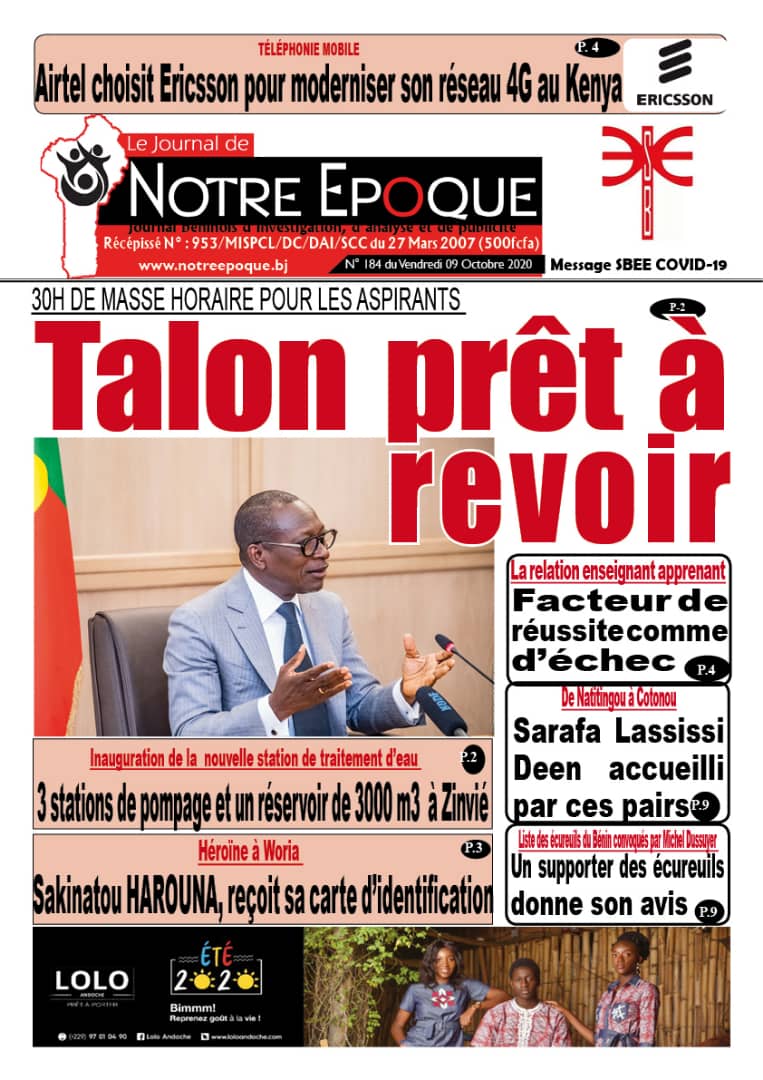 10 octobre 2020 Télécharger : Notre Epoque 184 du Vendredi 09 Octobre 2020 Post navigation Précédent Liste des écureuils du Bénin convoqués par Michel Dussuyer supporter des écureuils donne son avisSuivant Lolo Andonche vendu par Louis G. Vlavonou dans le consommons local Laisser un commentaire Annuler la réponseVous devez vous connecter pour publier un commentaire. Voir aussi Actualités La Une Médias et inclusion financière au Bénin Le RJCIF créé, Adam HOUETENON élu Président 12 décembre 2025 Actualités La Une Politique LES MINISTRES DES AFFAIRES ÉTRANGÈRES DU NIGÉRIA ET DU BÉNIN TIENNENT UNE CONFÉRENCE DE PRESSE CONJOINTE SUR LE RÉTABLISSEMENT DE LA GOUVERNANCE DÉMOCRATIQUE AU BÉNIN ET LA SÉCURITÉ RÉGIONALE 12 décembre 2025 Actualités La Une JIV 2025 : L’AnpE et la PNOVEJ célèbrent les volontaires sous le signe de l’engagement citoyen 12 décembre 2025
