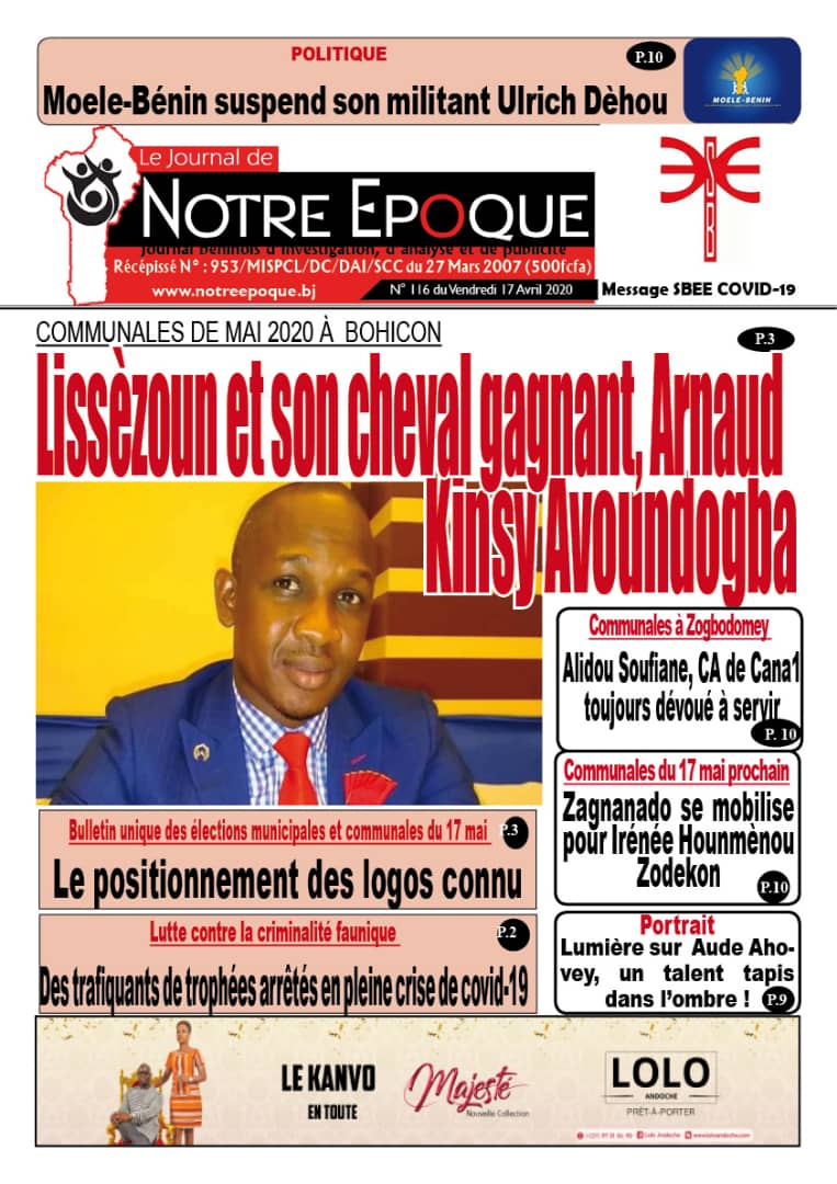 17 avril 2020 Télécharger : Notre Epoque 116 du Vendredi 17 Avril 2020 Post navigation Précédent NécrologieSuivant Suspendu, Ulrich Dèhou fait un recours gracieux Laisser un commentaire Annuler la réponseVous devez vous connecter pour publier un commentaire. Voir aussi Actualités La Une Médias et inclusion financière au Bénin Le RJCIF créé, Adam HOUETENON élu Président 12 décembre 2025 Actualités La Une Politique LES MINISTRES DES AFFAIRES ÉTRANGÈRES DU NIGÉRIA ET DU BÉNIN TIENNENT UNE CONFÉRENCE DE PRESSE CONJOINTE SUR LE RÉTABLISSEMENT DE LA GOUVERNANCE DÉMOCRATIQUE AU BÉNIN ET LA SÉCURITÉ RÉGIONALE 12 décembre 2025 Actualités La Une JIV 2025 : L’AnpE et la PNOVEJ célèbrent les volontaires sous le signe de l’engagement citoyen 12 décembre 2025