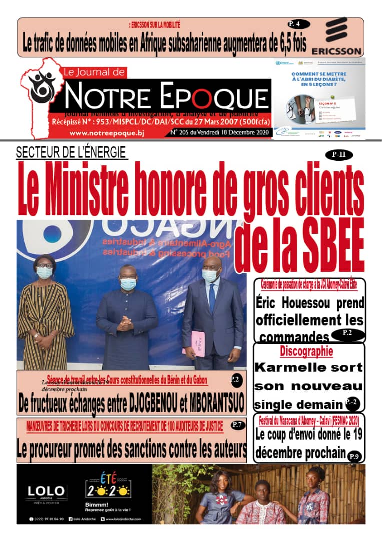 18 décembre 2020 Télécharger : Notre Epoque 205 du Vendredi 18 Décembre 2020 Post navigation Précédent Le Ministre Dona Jean-Claude HOUSSOU visite deux gros clients de la SBEESuivant Le Septentrion adopte ‘ LA FACE CACHÉE DE PATRICE TALON ‘(Les mérites de l’auteur Magloire Dato salués ) Laisser un commentaire Annuler la réponseVous devez vous connecter pour publier un commentaire. Voir aussi Actualités La Une Médias et inclusion financière au Bénin Le RJCIF créé, Adam HOUETENON élu Président 12 décembre 2025 Actualités La Une Politique LES MINISTRES DES AFFAIRES ÉTRANGÈRES DU NIGÉRIA ET DU BÉNIN TIENNENT UNE CONFÉRENCE DE PRESSE CONJOINTE SUR LE RÉTABLISSEMENT DE LA GOUVERNANCE DÉMOCRATIQUE AU BÉNIN ET LA SÉCURITÉ RÉGIONALE 12 décembre 2025 Actualités La Une JIV 2025 : L’AnpE et la PNOVEJ célèbrent les volontaires sous le signe de l’engagement citoyen 12 décembre 2025