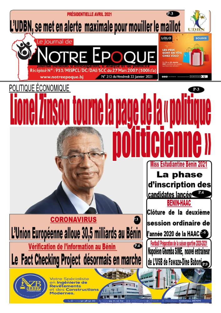 22 janvier 2021 Télécharger : Notre Epoque 212 du Vendredi 22 Janvier 2021 Post navigation Précédent Lionel Zinsou tourne la page de la « politique politicienne »Suivant Jean Eudes Mitokpe parle de Joel Aivo / Il n’est pas prêt pour 2021 Laisser un commentaire Annuler la réponseVous devez vous connecter pour publier un commentaire. Voir aussi Actualités La Une Assemblée Générale UPMB : Hervé Prudence Hessou, plébiscité président ! 4 décembre 2025 Actualités Agriculture La Une Projet CASCADE /Adoption des Régimes Alimentaires Sains et Équilibrés pour la Résilience des Ménages au Bénin : ASCINB outille les points focaux communaux et relais départementaux de ses OSC membres et partenaires des départements du Sud 3 décembre 2025 Actualités La Une Sports CAN Maroc 2025: Louis Houngnandandé et Éric Ayimavo retenus comme officiels 3 décembre 2025