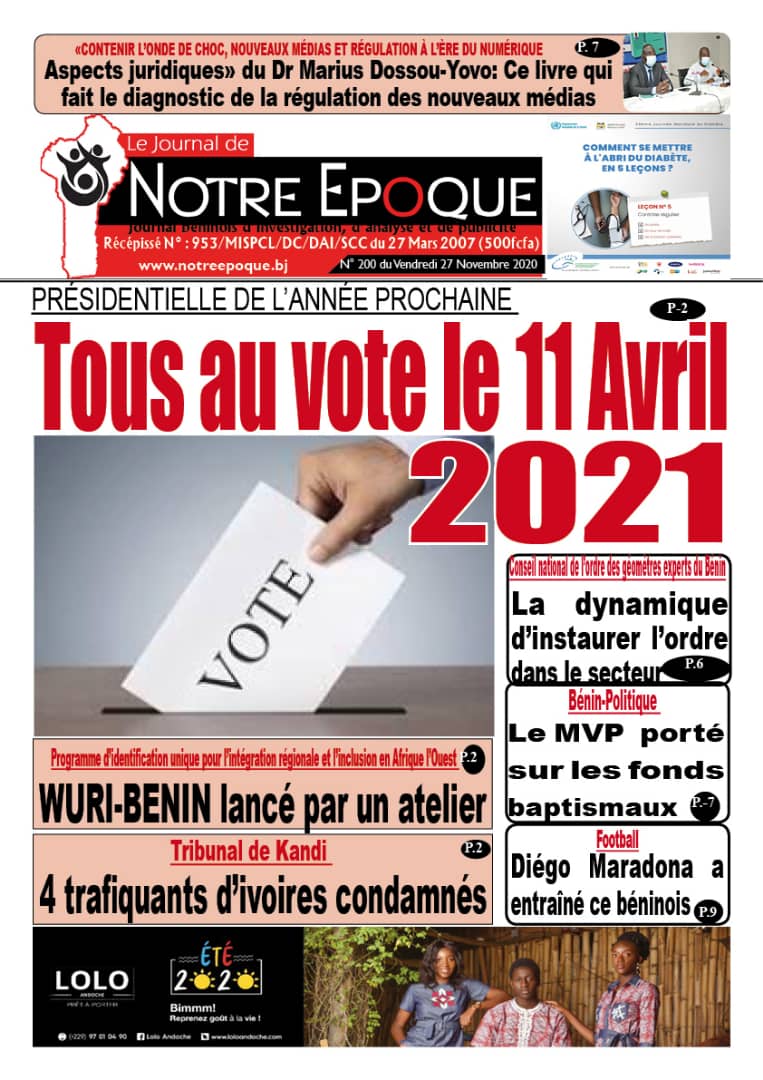 27 novembre 2020 Télécharger : Notre Epoque 200 du 27 Novembre 2020 Post navigation Précédent Le marché de l’économie numérique en Afrique représenterait 180 milliards de dollars selon un rapport de Google et d’IFCSuivant Bénin: les grandes décisions du conseil des ministres de ce mercredi 02 décembre 2020 avec une nomination Laisser un commentaire Annuler la réponseVous devez vous connecter pour publier un commentaire. Voir aussi Actualités La Une Médias et inclusion financière au Bénin Le RJCIF créé, Adam HOUETENON élu Président 12 décembre 2025 Actualités La Une Politique LES MINISTRES DES AFFAIRES ÉTRANGÈRES DU NIGÉRIA ET DU BÉNIN TIENNENT UNE CONFÉRENCE DE PRESSE CONJOINTE SUR LE RÉTABLISSEMENT DE LA GOUVERNANCE DÉMOCRATIQUE AU BÉNIN ET LA SÉCURITÉ RÉGIONALE 12 décembre 2025 Actualités La Une JIV 2025 : L’AnpE et la PNOVEJ célèbrent les volontaires sous le signe de l’engagement citoyen 12 décembre 2025