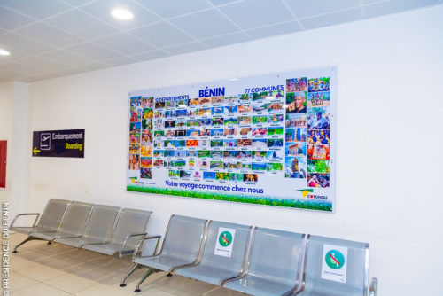 Imposant, coloré et attrayant, ce mur reparti sur plusieurs affiches situées aussi bien dans le hall d’enregistrement qu’à la salle d’embarquement est inspiré de la campagne digitale « Destination Bénin » initiée par le gouvernement en marge de la tournée de reddition de compte du Président Patrice TALON en novembre 2020. Il présente plusieurs attraits culturels et touristiques ainsi qu’une mosaïque récapitulative des 77 communes constitutives des 12 départements du Bénin avec en prime le mot « Bienvenue » dans la langue de la localité.