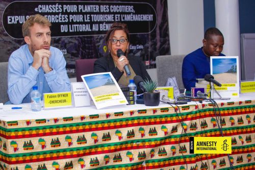 « Chassés pour planter des cocotiers, expulsions forcées pour le tourisme et l’aménagement du littoral au Bénin », tel est le titre du rapport effectué par les responsables d’Amnesty International sur des missions de recherches menées au Bénin entre 2022 et 2023 dont les conclusions du rapport ont été présentées au public et aux professionnels des médias le jeudi 7 décembre 2023. Sans langues de bois, Samira Daoud, Directrice régionale Afrique de l’Ouest et Afrique Centrale dans ses propos présenté le contexte dans lequel Amnesty International qui est une association nationale convaincue que lorsque les droits humains sont en jeu, chaque combat mérite une victoire a travaillé de 2022 à 2023 afin de produire ce rapport. Pour elle, depuis l’avènement de la rupture, le tourisme est devenu un des projets phares dont le gouvernement béninois a décidé d’accompagner et c’est dans cette optique qu’ils ont décidé d’expulser certaines populations afin d’aménager le littoral en plantant des cocotiers. Sans être contre le projet du gouvernement, elle dénonce les violations du droit humain telles que l’absence ou l’insuffisance de consultation des communautés affectées, la faible indemnisation des personnes déguerpies pour leur réinstallation et l’absence de recours juridique observés par la mission entre 2022 et 2023 dans le cadre de ce projet gouvernemental. « Je regrette les conditions dans lesquelles ces expulsions ont été effectuées, car elles n’ont respecté aucun droit humain et économique, et dans ce rapport vous verrez que toutes ces populations souffrent aujourd’hui à cause des répercussions sur les droits socio-économiques des personnes chassées sur leurs lieux d’habitations » a-t-elle signifié. Abondant dans le même sens que la directrice régionale Afrique de l’Ouest et Afrique Centrale Fabien Offner, Chercheur principal sur le Bénin d’Amnesty International a expliqué que son institution a travaillé sur près de quatre quartiers ou villages de ville de Cotonou à Ouidah ou des milliers de personnes ont été victimes d’expulsions forcées depuis 2021. « Amnesty International a observé des manquements des autorités béninoises au droit national et aux obligations du droit international des droits humains commis avant, pendant et après les expulsions » a-t-il déclaré. Observant les manquements observés sur le projet de développement touristique du littoral, Dieudonné Dagbéto a expliqué que Amnesty International dans ce rapport a effectuées cinq recommandations au gouvernement béninois afin de ne pas bafouer les droits de ces derniers avant, pendant et après afin que les droits humains , économiques et culturelles soient respectés par les institutions en charge de ce vaste projet car selon le rapport de nombreuse personnes ont perdu leur emploi ou ont vu leurs conditions de travailler se dégrader avec des conséquences sur leurs différents droits(économiques, sociales et culturelles).