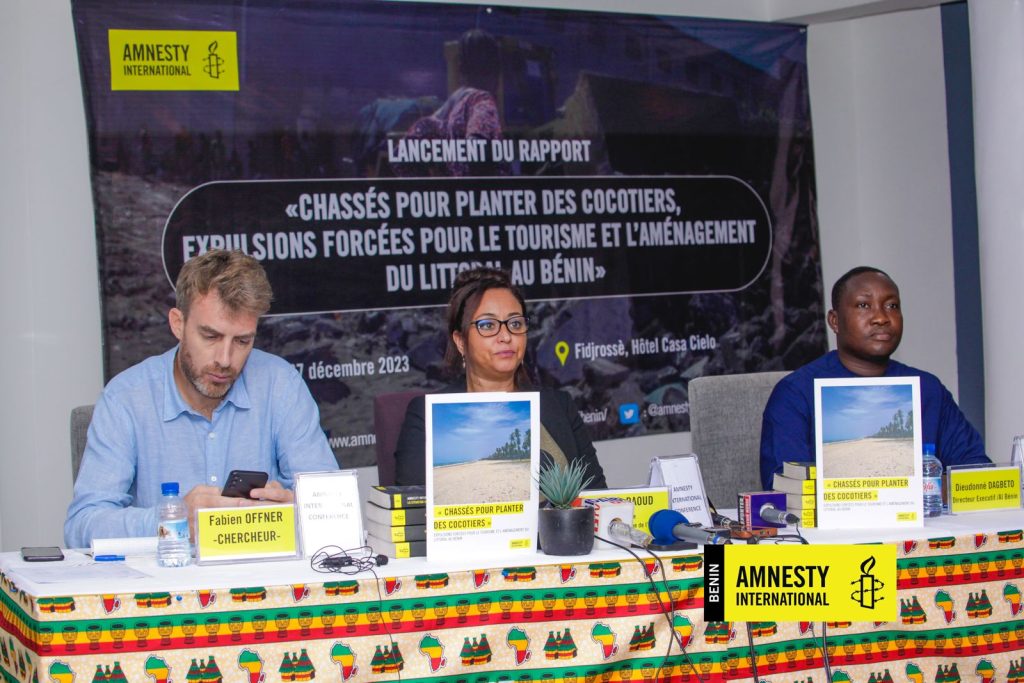 Les responsables d’Amnesty International Bénin ont animé dans la matinée du jeudi 7 décembre 2023 dans les locaux de l’hotêl Casa Cielo à Cotonou une conférence de presse afin de présenter aux professionnels les conclusions issues du rapport « Chassés pour planter des cocotiers, expulsions forcées pour le tourisme et l’aménagement du littoral au Bénin ». Objectif, faire part des violations des droits de l’homme et international constatés par l’institution.