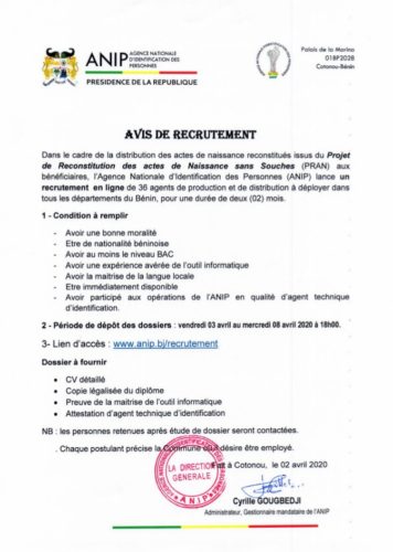 Dans le cadre de la distribution des actes de naissance issus du projet PRAN, l’Anip recrute des agents. Voici les profils et pièces à fournir.