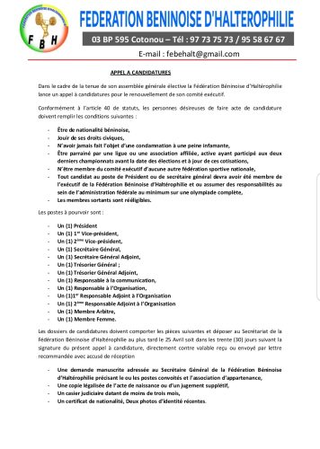 28 mars 2022 Lire le communiqué de l’appel à candidature F.A Post navigation Précédent Les résultats de la J6 Retour Conférence Sud et de la J7 Retour Conférence NordSuivant L’avis tranché d’Oswald Homeky Voir aussi Actualités La Une Médias et inclusion financière au Bénin Le RJCIF créé, Adam HOUETENON élu Président 12 décembre 2025 Actualités Sports CAN MAROC 2025 : les 28 Guépards retenus par Rohr ! 12 décembre 2025 Actualités La Une Politique LES MINISTRES DES AFFAIRES ÉTRANGÈRES DU NIGÉRIA ET DU BÉNIN TIENNENT UNE CONFÉRENCE DE PRESSE CONJOINTE SUR LE RÉTABLISSEMENT DE LA GOUVERNANCE DÉMOCRATIQUE AU BÉNIN ET LA SÉCURITÉ RÉGIONALE 12 décembre 2025