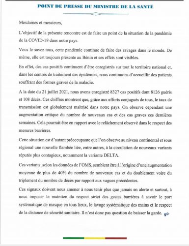 Le Ministre de la santé Benjamin HOUNKPATIN a fait un point le jeudi 22 juillet 2021, de la situation de la Covid-19 au Bénin. À l’occasion, il a souligné la résurgence des cas dans la sous-région et appelé au respect strict des gestes barrières. Tout en exhortant la population à sortir massivement pour se faire vacciner, il a rappelé les mesures gouvernementales relatives à l’encadrement des grandes manifestations.