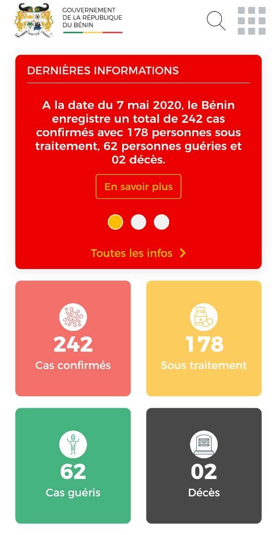 A la date du 7 mai 2020, le Bénin enregistre un total de 242 cas confirmés avec 178 personnes sous traitement, 62 personnes guéries et 02 décès.