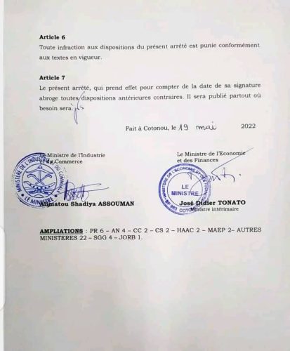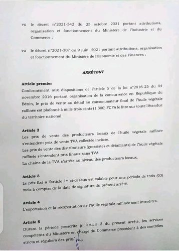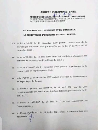 Ci-joint l’Arrêté interministériel N°2022/09/MIC/MEF/DC/SGM/DCI/SA/028SGG22 portant plafonnement du prix de l’huile végétale raffinée en République du Bénin pris ce jeudi 19 mai 2022.