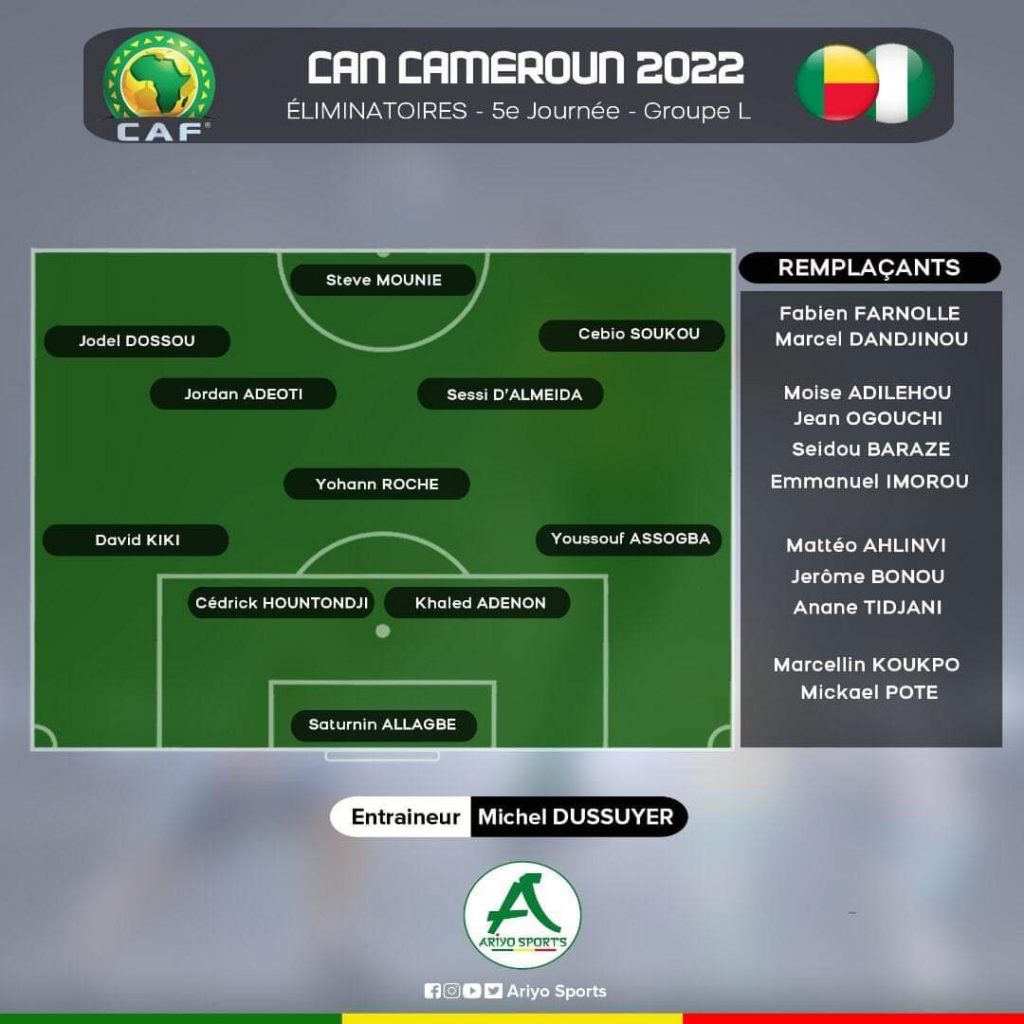 Pour défier les Super Eagles du Nigéria, c’est Saturnin Allagbé qui aura la responsabilité de garder les cages. Privée de Olivier Verdon, la charnière centrale sera composée de Cedric Hountondji, Khaled Adenon et Yohan Roche. Sur les ailes, c’est David Kiki et Youssouf Assogba qui ont été préférés à la paire Imorou-Barazé. Le milieu de terrain classique est reconduit avec Jordan Adeoti et Sessi d’Almeida à la baguette. Enfin, l’animation offensive sera assurée par Jodel Dossou, Cebio Soukou et Steve Mounié en pointe.