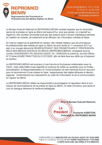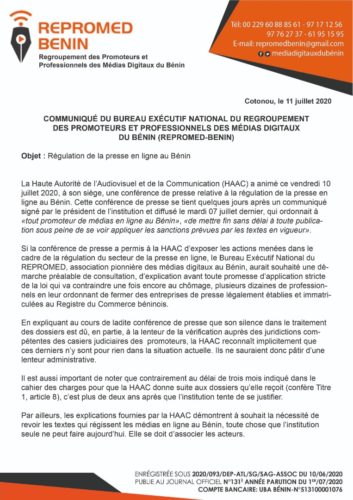 13 juillet 2020 PDF ET photos des communiqués Télécharger : Post navigation Précédent 10 bonnes raisons de ne pas fumer la CHICHASuivant NOTE D’INFORMATION SUR LA GESTION DES PASSEPORTS AUX PASSAGERS ENTRANTS AU BENIN. Laisser un commentaire Annuler la réponseVous devez vous connecter pour publier un commentaire. Voir aussi Actualités La Une Médias et inclusion financière au Bénin Le RJCIF créé, Adam HOUETENON élu Président 12 décembre 2025 Actualités Sports CAN MAROC 2025 : les 28 Guépards retenus par Rohr ! 12 décembre 2025 Actualités La Une Politique LES MINISTRES DES AFFAIRES ÉTRANGÈRES DU NIGÉRIA ET DU BÉNIN TIENNENT UNE CONFÉRENCE DE PRESSE CONJOINTE SUR LE RÉTABLISSEMENT DE LA GOUVERNANCE DÉMOCRATIQUE AU BÉNIN ET LA SÉCURITÉ RÉGIONALE 12 décembre 2025