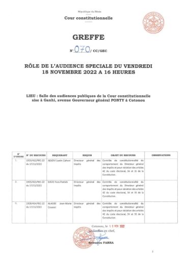 En effet, Patrick Djivo, Justin Adjovi et Jean-Marie Allagbé tous contraints à se retirer de la course pour les législatives du 08 Janvier, pour défauts de quitus fiscaux, ont porté conjointement un recours contre l’administration fiscale béninoise. Le chef d’accusation trouvé par les candidats échus des Démocrates est : » Contrôle de constitutionnalité du comportement du Directeur Général des Impôts et violation des articles 42 du code électoral, 34 et 35 de la constitution ». Pour son caractère urgent, la cour a programmé une audience spéciale pour étudier le dossier. L’audience se tiendra ce vendredi 18 Novembre 2022 à 16h à la salle des audiences publiques de la Cour Constitutionnelle.