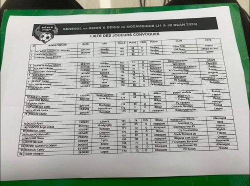 Pour le compte des éliminatoires de la coupe d’Afrique Côte d’Ivoire 2023, Moussa Latoundji, Sélectionneur par intérim des écureuils du Bénin a rendu public la liste des joueurs retenus pour le compte de la première et deuxième journées. Sur cette liste vingt-six joueurs ont été convoqués, afin de défendre les couleurs nationales. Signalons que la première rencontre des hommes de Moussa Latoundji sera face au Sénégal le 4 juin prochain du côté de Dakar et le 8 juin ils recevront le Mozambique au stade Général Mathieu Kérékou.