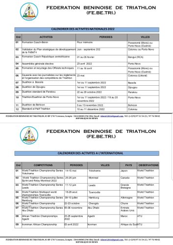 Les membres du comité exécutif de la Fédération béninoise de Triathlon (FEBETRI) à sa tête Richard Assah ont procédés il y a quelques jours à la publication du calendrier des activités (nationales et internationales) a menées pour le compte de 2002. Ainsi, dans ce calendrier, comme activité nationale a exécutée il y a le duathlon à Bassila et à Djougou prévu pour se dérouler du 1er au 11 septembre prochain dans les deux villes tandis que pour le compte des activités à l’international, on note le world Triathlon Championship Series Yokohama qui aura lieu du 14 au 15 mai au Japon. Rappelons que le triathlon est une épreuve d’athlétisme composée de trois épreuves à savoir : la natation , la course cycliste et la course à pied.