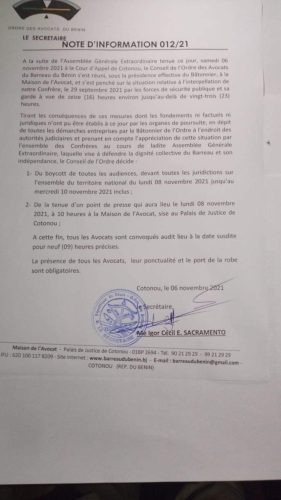 Les avocats du Bénin boycotteront toutes les audiences devant toutes les juridictions sur l’ensemble du territoire national du lundi 08 novembre au mercredi 10 novembre 2021 inclus.