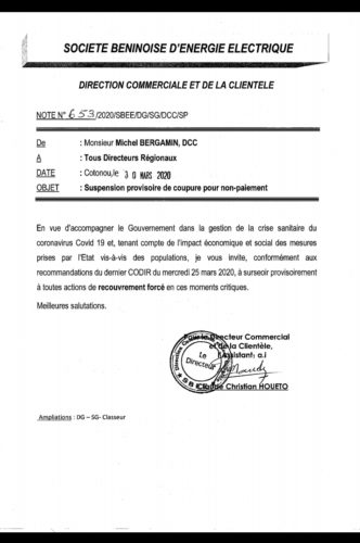 A en croire la note 653/202/SBEE/DG/SG/DCC/SP, adressée à tous les directeurs régionaux par le Directeur commercial et de la clientèle (DCC), Michel Bergamin instruit ses collaborateurs à la suspension provisoire de coupures pour non-paiement.