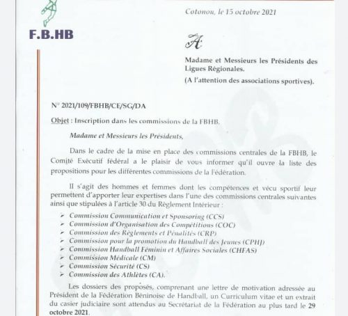 «Dans le cadre de la mise en place des commissions centrales de la Fédération Béninoise de Handball, le comité exécutif fédéral a le plaisir de vous informer qu’il ouvre la liste des propositions pour les différentes commissions de la Fédération. Il s’agit des hommes et femmes dont les compétences et vécu sportif leur permettent d’apporter leurs expertises dans l’une des commissions centrales», peut-on lire dans cette lettre de la FBHB adressée aux présidents des Ligues Régionales, à l’attention des associations sportives.
